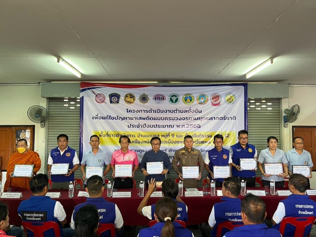 วันที่ 11 มีนาคม 2568 เวลา 10.00 น. พ.ต.ท.สงคราม ม้าเมือง รอง ผกก.ป.สภ.เมืองแพร่ ,พ.ต.ต.หญิง กมลทิพย์ สุนันทะพงศ์ สวป.(ชส.)สภ.เมืองแพร่ พร้อมด้วยคณะทำงานชุดปฏิบัติการตำบลยั่งยืนฯ และจนท.ตำรวจชุดปฏิบัติการชุมชนยั่งยืน สภ.เมืองแพร่ ร่วมกับ ปลัดอำเภอเมืองแพร่ , สาธารณสุขอำเภอเมืองแพร่ ,นายกอบต.เหมืองหม้อ , กำนันตำบลเหมืองหม้อ ,ผู้ใหญ่บ้านแดนชล หมู่ที่ 9,ผู้ใหญ่บ้านสันติธรรม หมู่ที่ 12 ต.เหมืองหม้อ,เจ้าอาวาสวัดกาซ้อง, ผอ.รพ.สต.บ้านสะบู, ผอ.รร.ชุมชนบ้านเหมืองหม้อ และเจ้าหน้าที่เกี่ยวข้อง ได้ดำเนินการจัดทำพิธีเปิดโครงการดำเนินงานตำบลยั่งยืน เพื่อแก้ไขปัญหายาเสพติดแบบครบวงจรตามยุทธศาสตร์ชาติ ประจำปีงบประมาณ พ.ศ.2568 , ร่วมลงนามบันทึกข้อตกลงความร่วมมือ (MOU) และร่วมกันทำประชาคม ครั้งที่ 2 ซึ่งผู้มาร่วมพิธีเปิดมีมติเห็นชอบมติชุมชน ตามหัวข้อที่กำหนดทุกหัวข้อ ณ ศาลาอเนกประสงค์ บ้านสันติธรรม หมู่ที่ 12 ต.เหมืองหม้อ อ.เมืองแพร่ จว.แพร่ โดยมี นายสมศักดิ์ สุขประเสริฐ นายอำเภอเมืองแพร่ เป็นประธานในพิธิ ฯ และได้ทำการตรวจหาสารเสพติดผู้นำชุมชนและผู้เข้าร่วมพิธี เบื้องต้นไม่พบสารเสพติดในร่างกายแต่อย่างใด