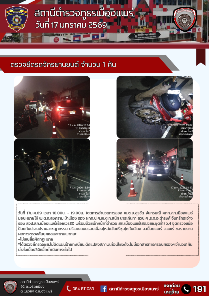 ตรวจยึดรถจักรยานยนต์ไม่ติดแผ่นป้ายทะเบียน ดัดแปลงสภาพ ท่อเสียงดัง ในพื้นที่รับผิดชอบ สภ.เมืองแพร่