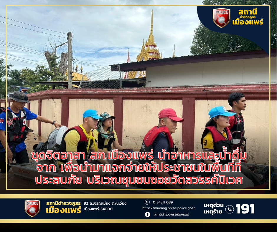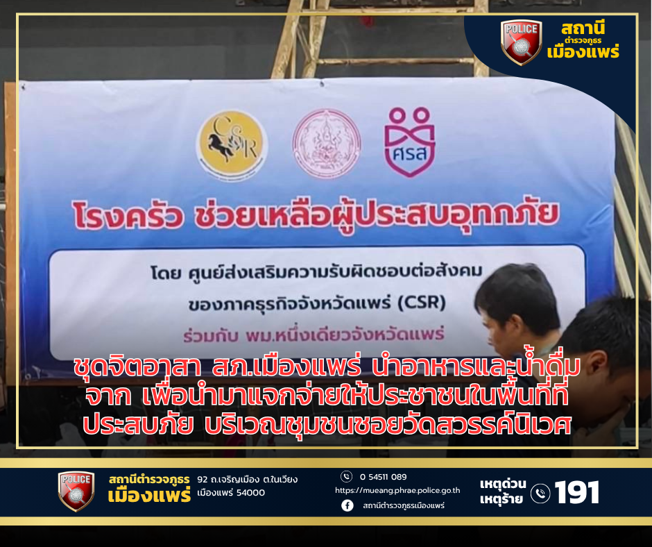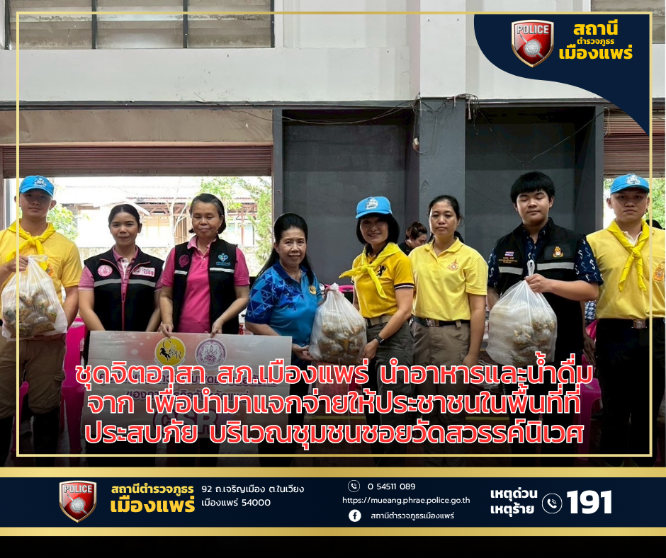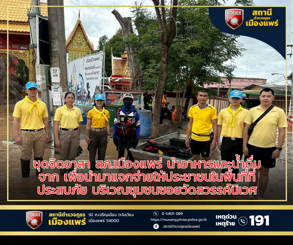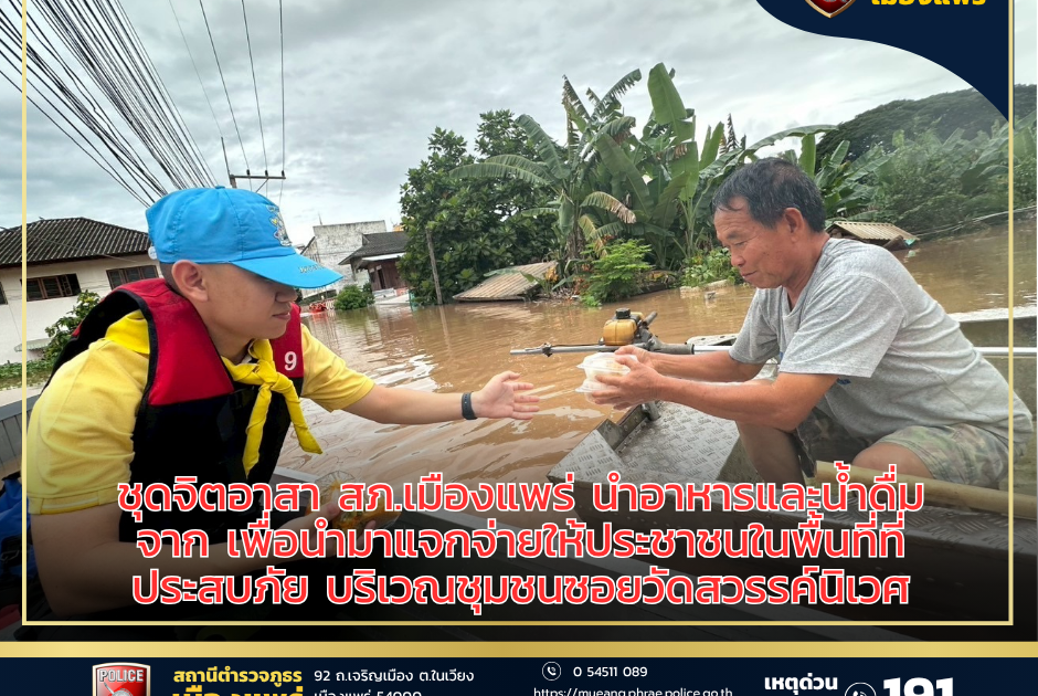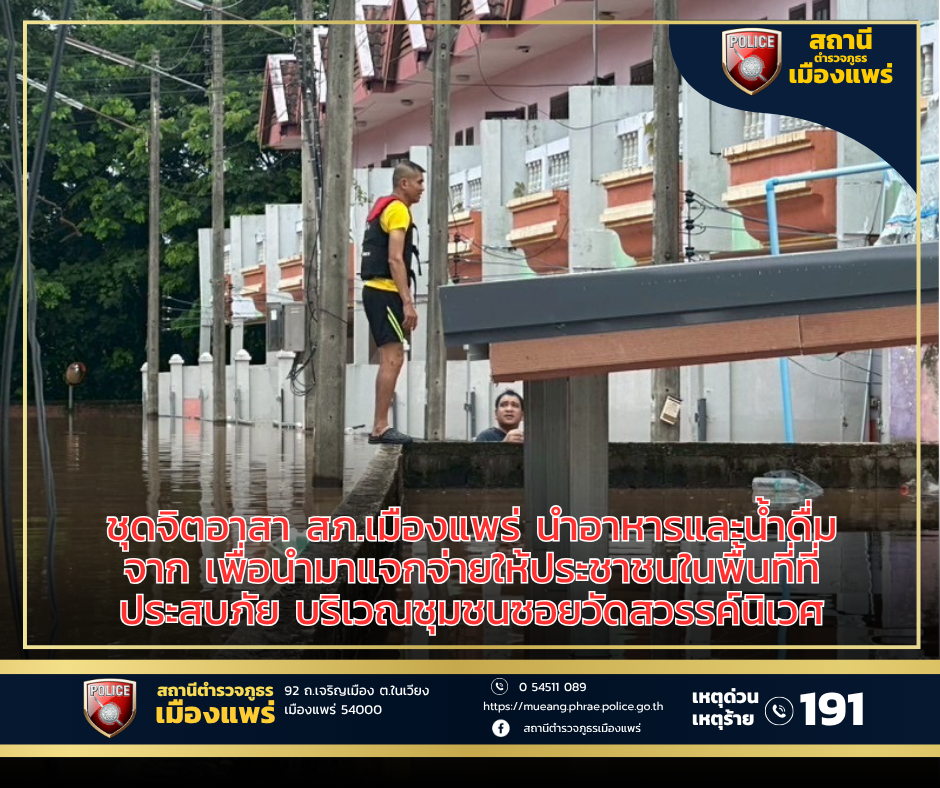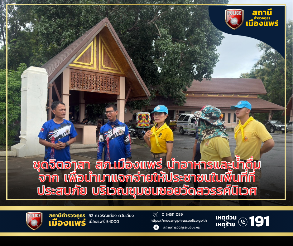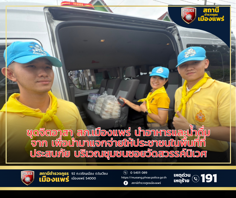 ตำรวจจิตอาสา สภ.เมืองแพร่ โดยได้รับสนับสนุนอาหารและน้ำดื่มจาก หน่วยงาน พม. เพื่อนำมาแจกจ่ายให้ประชาชนในพื้นที่ที่ประสบภัย จ.แพร่