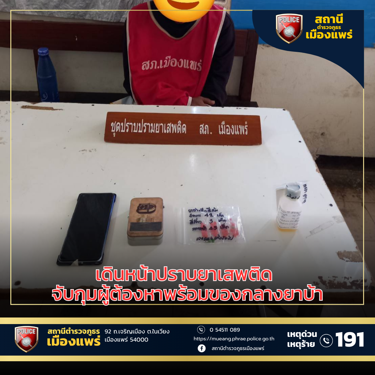 ตำรวจเมืองแพร่เดินหน้าปราบยาเสพติด จับกุมผู้ต้องหาพร้อมของกลางยาบ้า