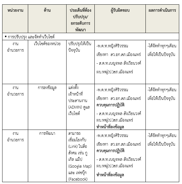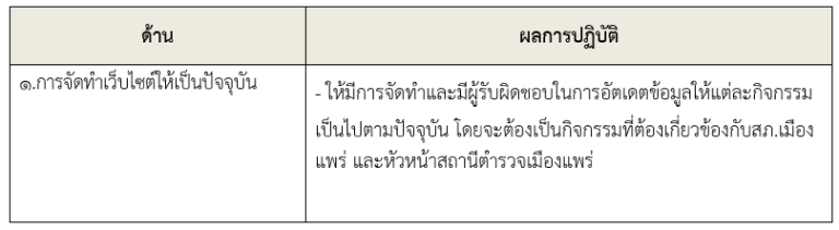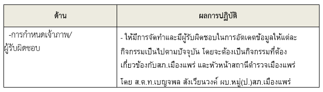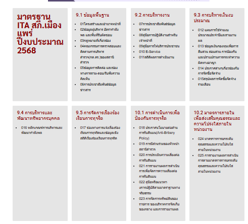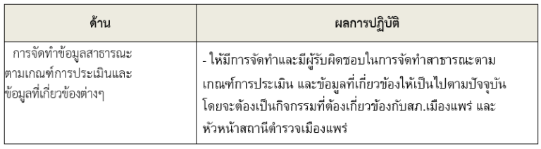ให้ข้าราชการตำรวจในสถานี นำช่องทางการเปิดเผยข้อมูลสาธารณะ (OIT) เปิดเผย ณ จุด ให้บริการ และ พัฒนาการให้บริการเพื่อสร้างความรวดเร็วและความสะดวกให้แก่ประชาชน ก่อนทำการประเมิน แบบวัดการรับรู้ สถานีตำรวจภูธรเมืองแพร่ จึงได้มีการประชุมเพื่อซักซ้อม และวางแผน เพื่อดำเนินการเกี่ยวกับ มาตรการ/ กิจกรรม การประเมินคุณธรรมและความโปร่งใส ในการดำเนินงานของหน่วยงานภาครัฐ (Integrity and Transparency Assessment : ITA) ของสถานีตำรวจ ประจำปีงบประมาณ พ.ศ.2568 เพื่อให้ ข้าราชการตำรวจในสังกัดรับทราบ และร่วมปฏิบัติตามมาตรการ/กิจกรรม พร้อมทั้งเตรียมความพร้อมในการรับการ ตรวจสอบจาก เจ้าหน้าที่สำนักงาน ป.ป.ช. ในระหว่างการดำเนินการตามมาตรการ/กิจกรรม ได้มีการติดตาม และรายงานผล รวมทั้งการเผยแพร่ข้อมูล OPEN DATA บนเว็บไซต์ของสถานีตำรวจภูธรเมืองแพร่ และมีการประชุมเพื่อวางแผนในการทำงาน มีการกำกับติดตามโดยผู้กำกับการสถานีตำรวจภูธรเมืองแพร่อย่างสม่ำเสมอ