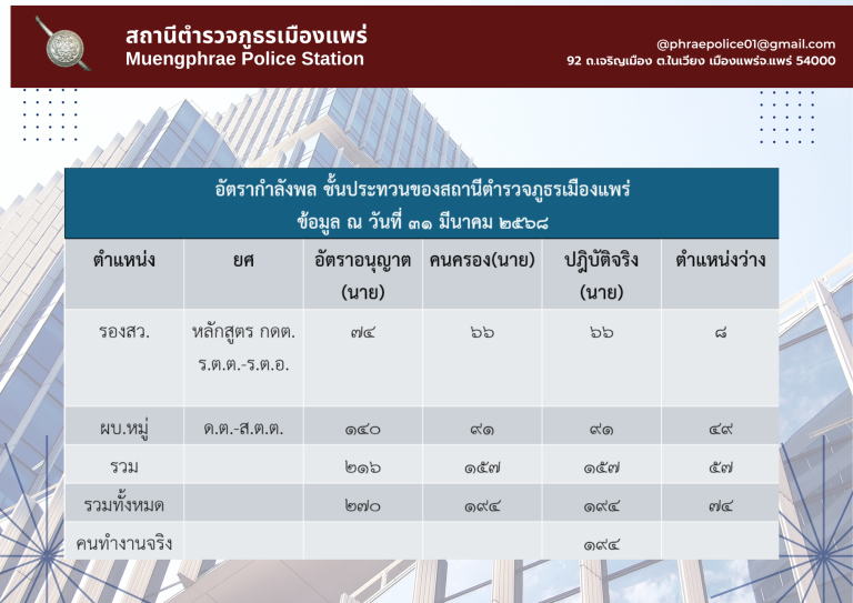 ข้อมูล อัตรกำลังพล ชั้น สัญญาบัตร / ประทวน ของสถานีตำรวจภูธรเมืองแพร่ ณ 31 มี.ค.68