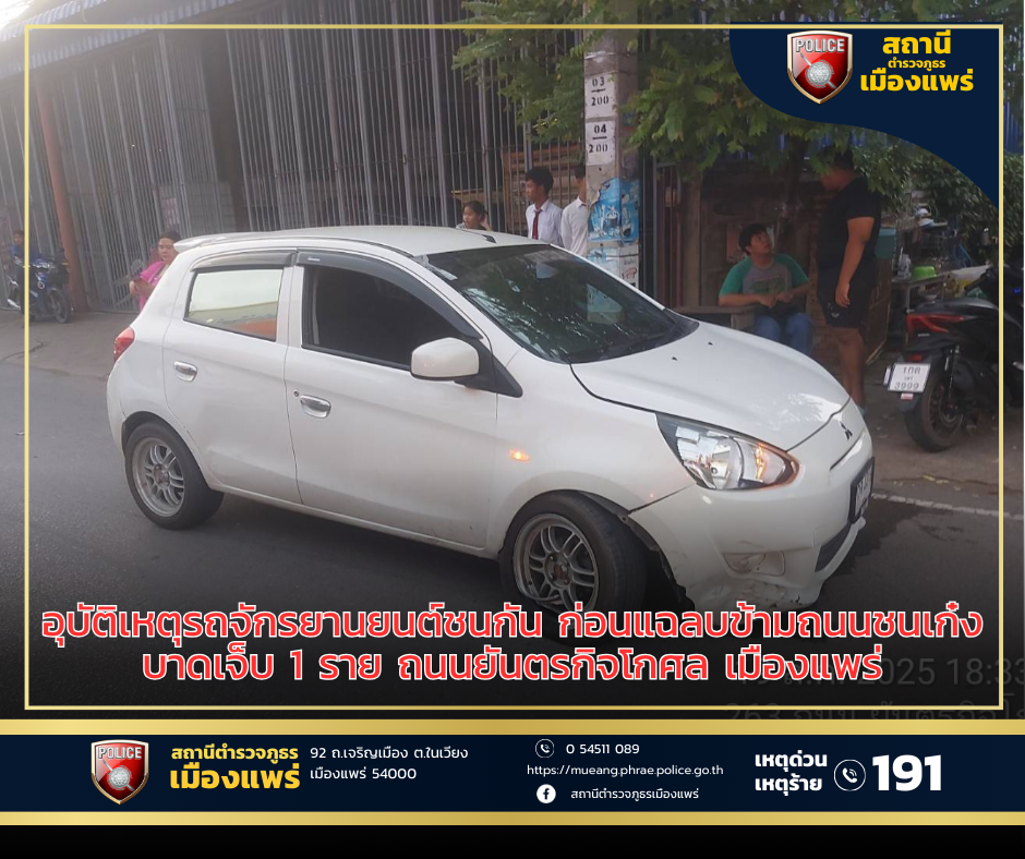 อุบัติเหตุรถจักรยานยนต์ชนกัน ก่อนแฉลบข้ามถนนชนเก๋ง บาดเจ็บ 1 ราย ถนนยันตรกิจโกศล เมืองแพร่ วันที่ 19
