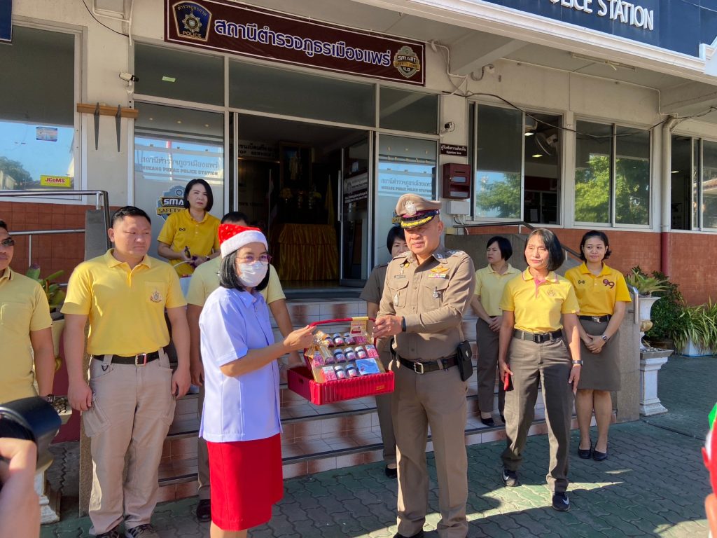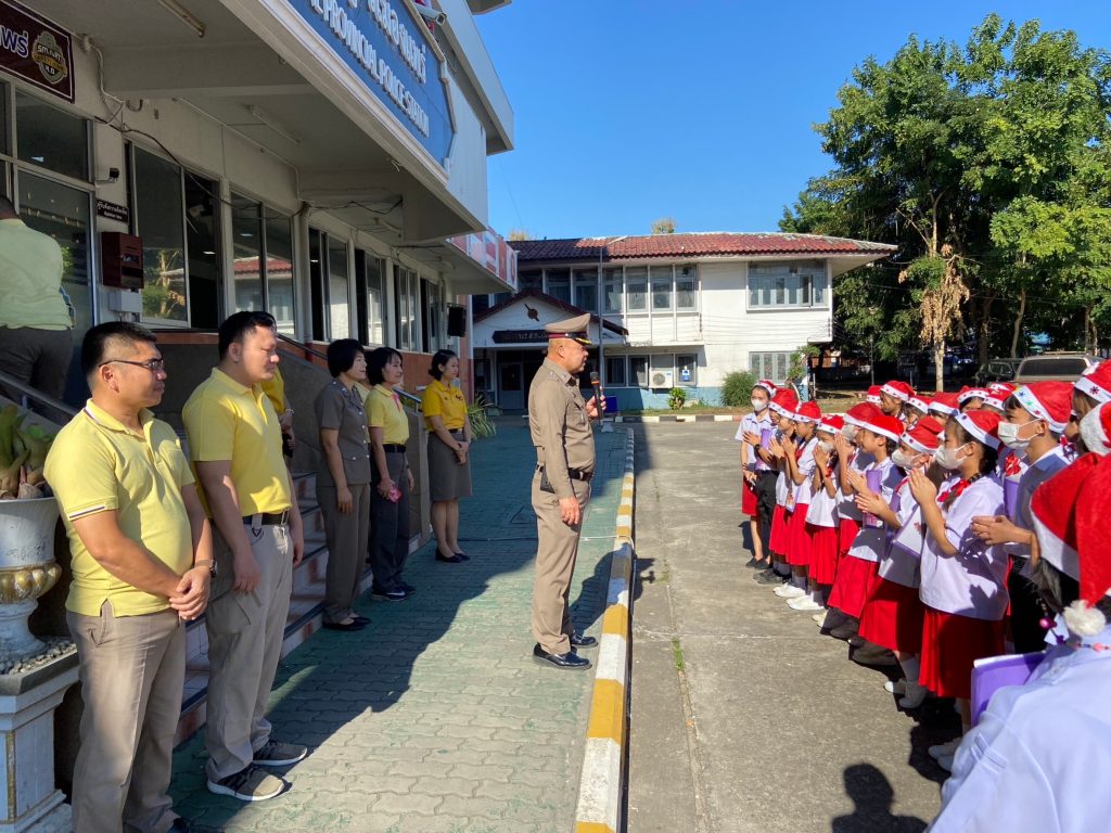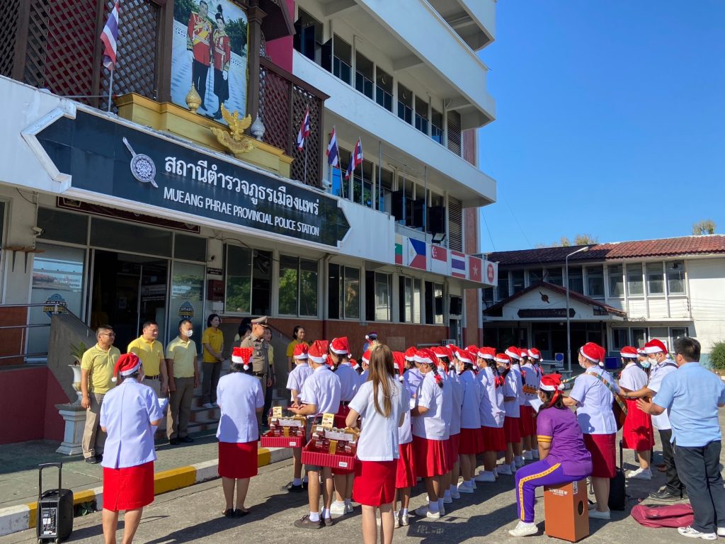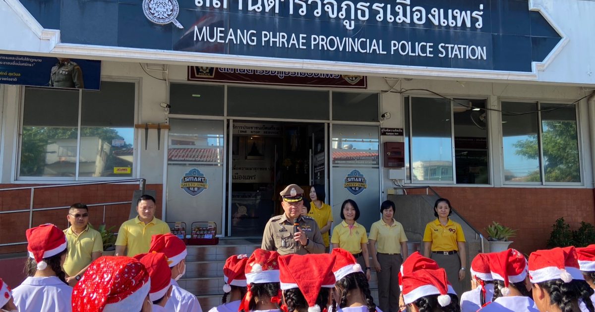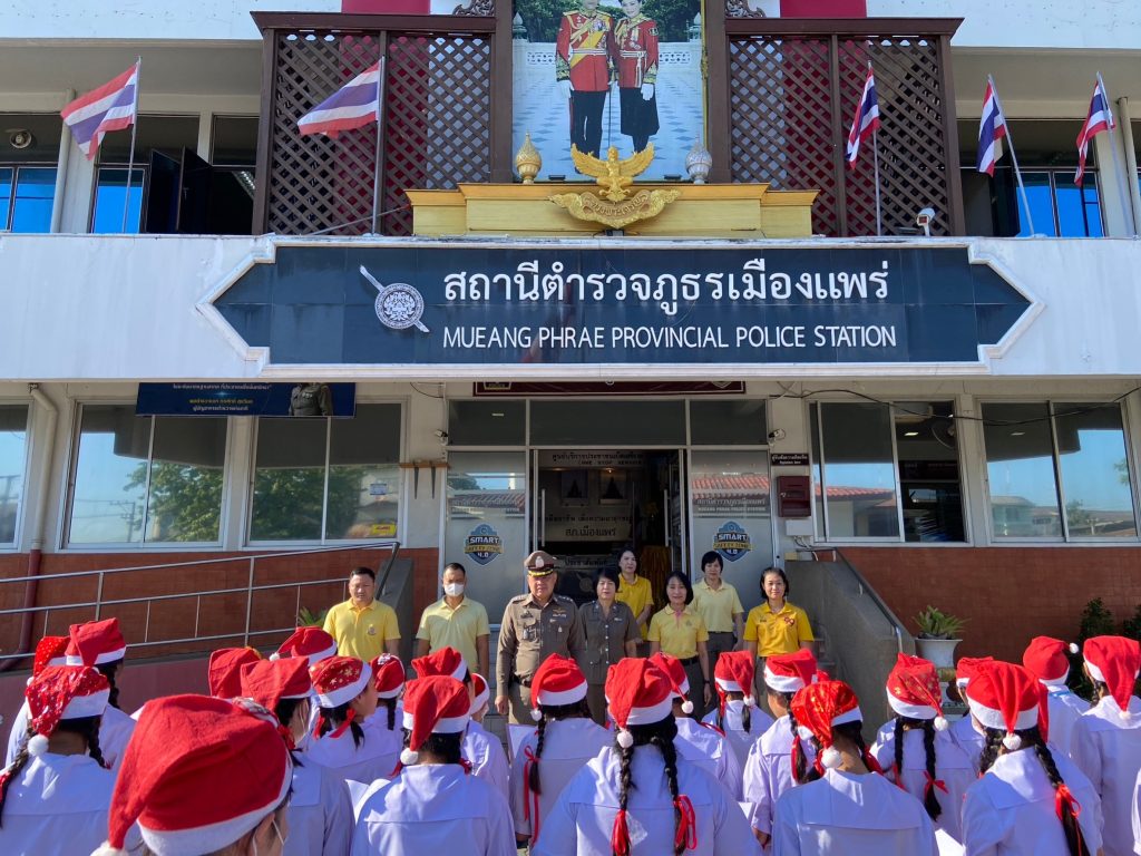 สภ.เมืองแพร่/ภ.จว.แพร่ พ.ต.อ.นรินทร์ วรรณมณี ผกก.สภ.เมืองแพร่, พ.ต.ต.หญิงศิริวรรณ เชียงทา สว.ธร.สภ.เมืองแพร่ และข้าราชการตำรวจฯ ร่วมกิจกรรมร้องเพลงอวยพรเนื่องในวันคริสต์มาส ของคณะครูและนักเรียนโรงเรียนเจริญราษฎร์ ณ สภ.เมืองแพร่ เมื่อวันที่ 19 ธ.ค.2566 เวลา 09.30 น.