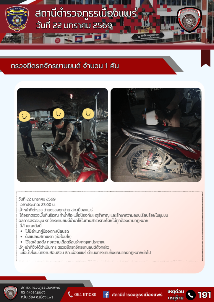 สภ.เมืองแพร่ ตรวจยึดจักยานยนต์ 1 คัน