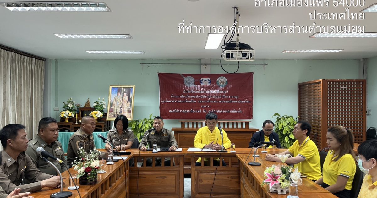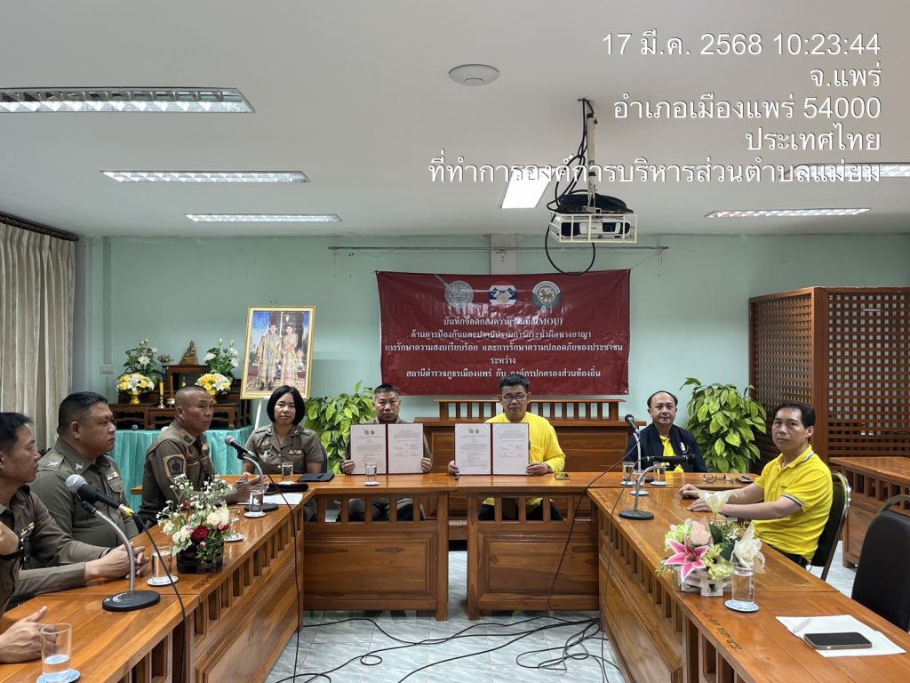 วันที่ 17 มี.ค.68 เวลา 10.00 น. ภายใต้การอำนวยการโดย พ.ต.อ.สุรชัย จันทรมณี ผกก.สภ.เมืองแพร่ มอบหมายให้ พ.ต.ท.สงคราม ม้าเมือง รอง ผกก.ป.ฯ, และ พ.ต.ต.หญิง กมลทิพย์ สุนันทะพงศ์ สวป.(ชส.)ฯ ชุด ชมส.สภ.เมืองแพร่ ร่วมกับ นายก อบต.แม่ยม ปลัด อบต.แม่ยม และเจ้าหน้าที่ อบต.แม่ยม ได้ดำเนินการทำ บันทึกข้อตกลงความร่วมมือ mou ด้านการป้องกันและปราบปราม การกระทำผิดทางอาญา การรักษาความสงบเรียบร้อย และการรักษาความปลอดภัยของประชาชน ระหว่างสถานีตำรวจภูธรเมืองแพร่ กับ องค์กรปกครองส่วนท้องถิ่น ณ ห้องประชุม อบต.แม่ยม ต.แม่ยม อ.เมือง จ.แพร่