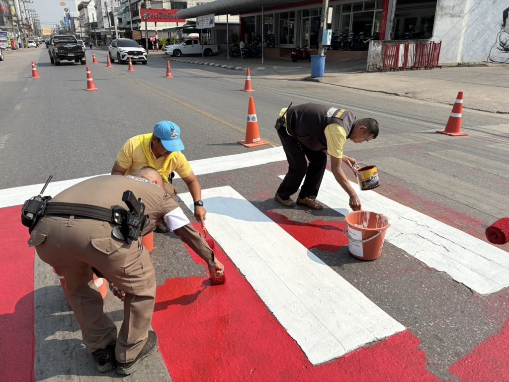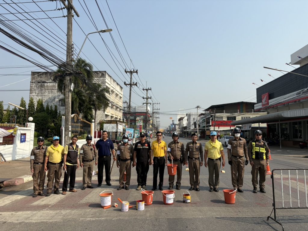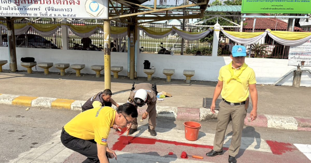 เจ้าหน้าที่ตำรวจจราจร สภ.เมืองแพร่ ร่วมกับเทศกิจเทศบาลเมืองแพร่ ในการทาสีทางม้าลายหน้าโรงเรียนพิริยาลัยจังหวัดแพร่