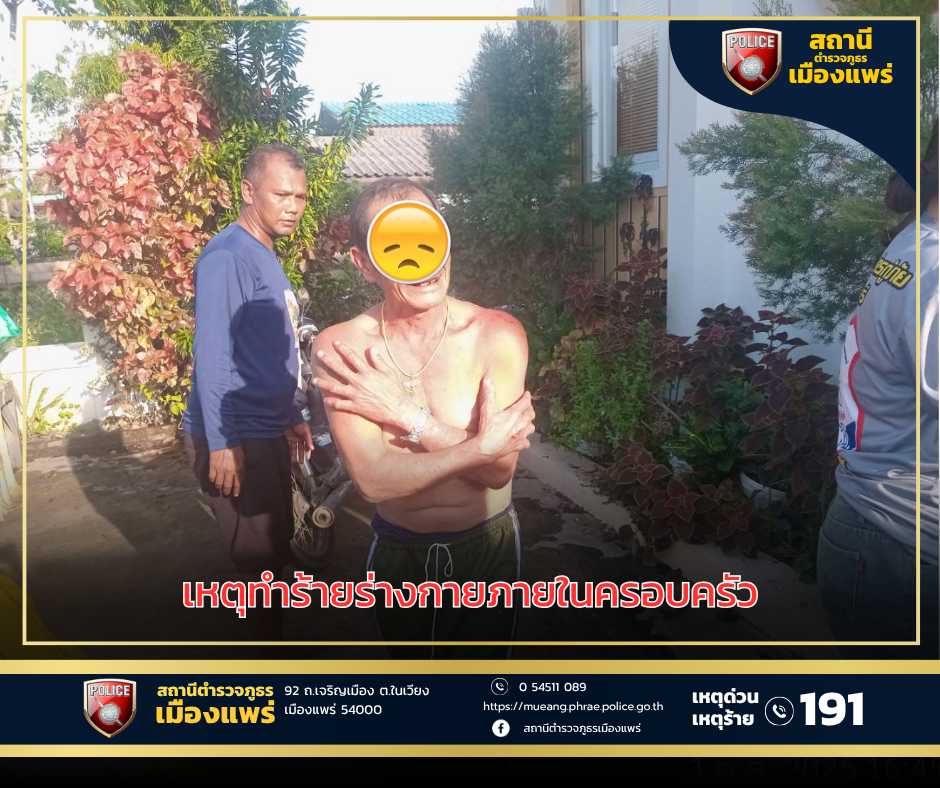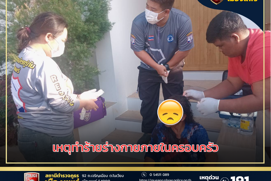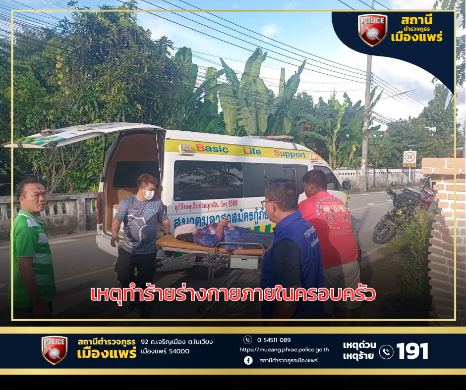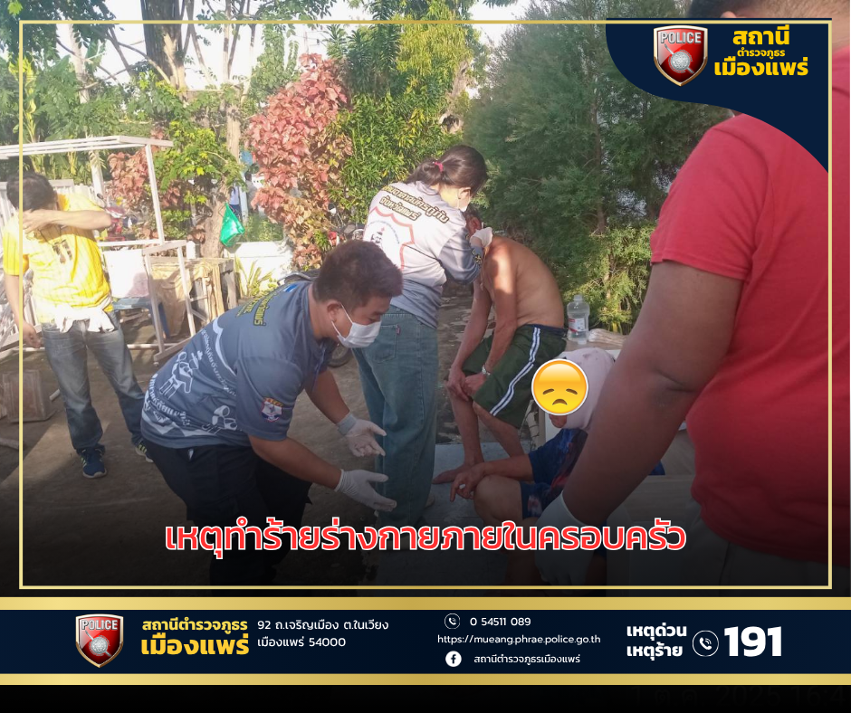 เหตุการณ์ทำร้ายร่างกายที่ ต.กาญจนา จ.แพร่ 01/10/2568 โดย admin / มาตราฐาน ITA 2568,ผลการปฎิบัติงานของสายงานป้องกันปราบปราม,ผลการปฏิบัติงานปราบปราม ต.ค.68 วันที่ 1 ต.ค .68.68 .เวลาประมาณ 16.40นสายตรวจตำบลนาจักร-กาญจนา ออหเหตุทำร้ายร่างกายม.6 ต.กาญจนามีผู้ได้บาดเจ็บ2คนเป็นหญิง1ชายหนึ่งกู้ภัยนำตัวผู้ได้รับบาดเจ็บส่งรพ.ผู้ก่อเหตุเป็นพี่ชายผู้ได้รับบาดเจ็บ Facebook iconFacebook