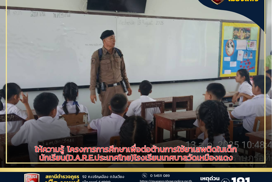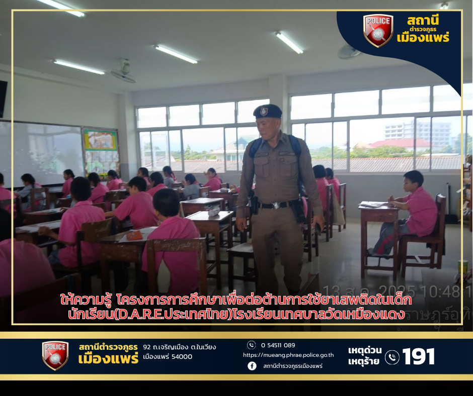 ให้ความรู้นักเรียนตามโครงการการศึกษาเพื่อต่อต้านการใช้ยาเสพติดในเด็กนักเรียน(D.A.R.E.ประเทศไทย) โรงเรียนเทศบาลวัดเหมืองแดง จ.แพร่